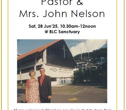 The Memorial Service for the late Rev & Mrs John Nelson will be held at Bedok Lutheran Church, 485 Bedok South Avenue 2, Singapore 469613 on 28 June 2025